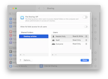 Few people know that their Mac has native file sharing functionality built-in. To use this feature: System Settings > General > Sharing and enable File Sharing. If you only want to share specific folders, add them to the Shared Folders list. If you only want specific users to access the folder, add them to its Users list. Otherwise, everyone will be able to access it.
